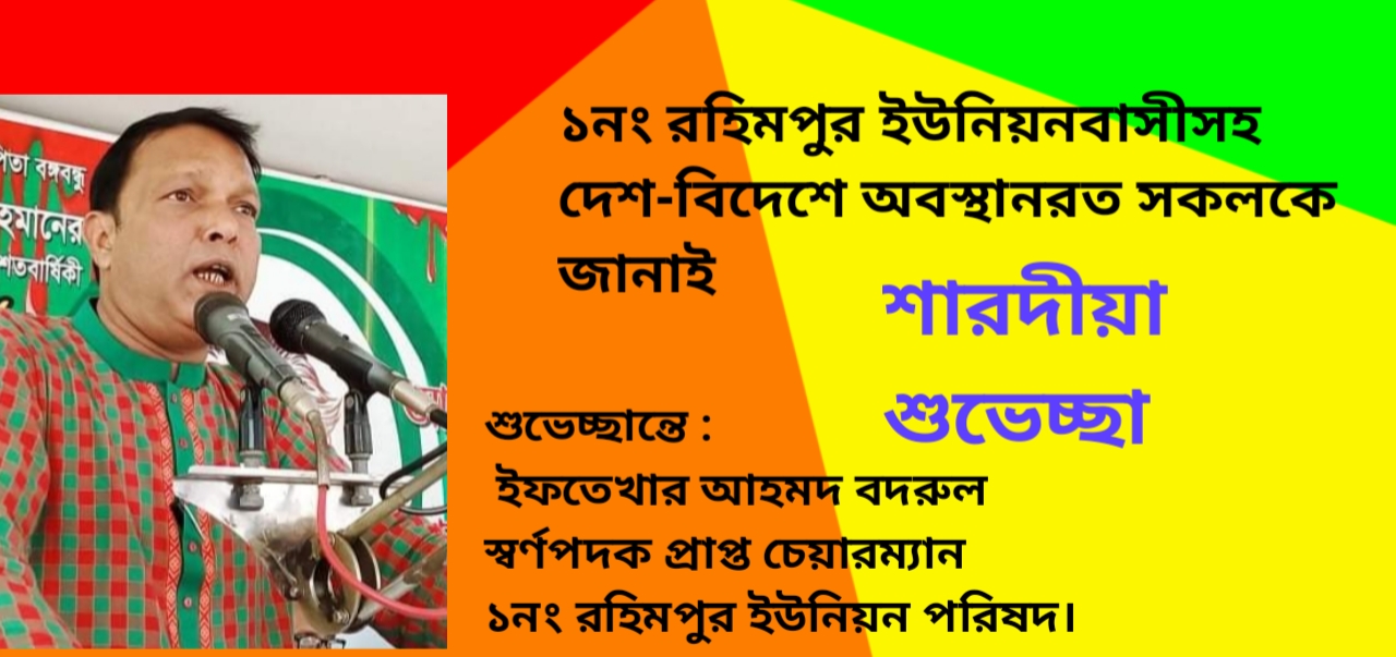 ১নং রহিমপুর ইউনিয়নের স্বর্ণপদকপ্রাপ্ত চেয়ারম্যান জনাব মো ইফতেখার আহমেদ বদরুল সর্বস্তরের হিন্দুধর্মালম্বীদের শারদীয় শুভেচ্ছা জানিয়েছেন।