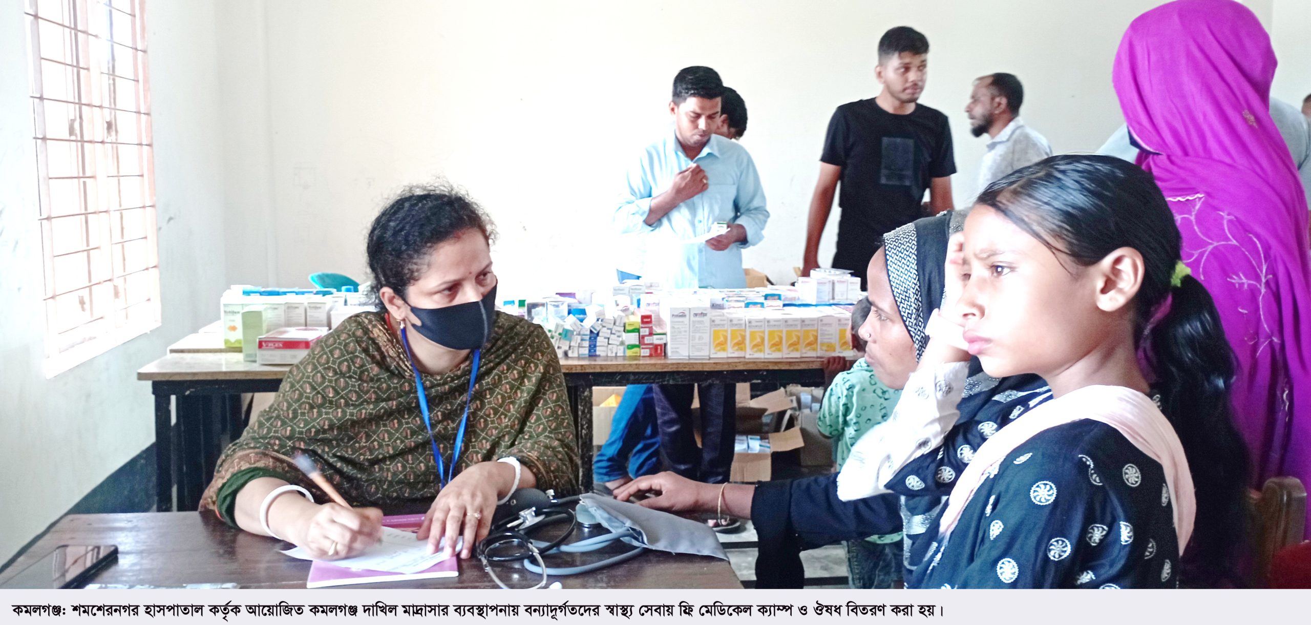 মৌলভীবাজারের কমলগঞ্জ উপজেলার শমশেরনগর হাসপাতাল কর্তৃক আয়োজিত বন্যাদূর্গতদের স্বাস্থ্য সেবায় ফ্রি মেডিকেল ক্যাম্প ও ঔষধ বিতরণ করা হয়েছে। শনিবার (৭ সেপ্টেম্বর) সকাল ১০টা থেকে বিকাল ৩টা পর্যন্ত বিশেষজ্ঞ ও অভিজ্ঞ ডাক্তার দ্বারা চিকিৎসা সেবা প্রদান ও বিনামূল্যে ঔষধ বিতরণ করা হয়। যুক্তরাজ্য প্রবাসী এ, কে, এম জিল্লুল হক, সৈয়দ মাসুম, ফ্রান্স প্রবাসী সৈয়দ তালেব আলী, সৈয়দা সানজিদা বেগম, মঈনুল ইসলাম খাঁন, ডাঃ কামাল আহমেদ, মোস্তাক আহমেদ, শেখ এম শাহিন শাহেদ ও মোঃ আতিকুর রহমানের আর্থিক সহযোগিতায় বালিগাঁও, বাল্লারপার, উজিরপুর, লংগুরপার ও পৌর এলাকার ৬ ও ৭ নং ওয়ার্ডের প্রায় ৫শতাধিক মানুষকে চিকিৎসা সেবা ও বিনামূল্যে ঔষধ প্রদান করা হয়।