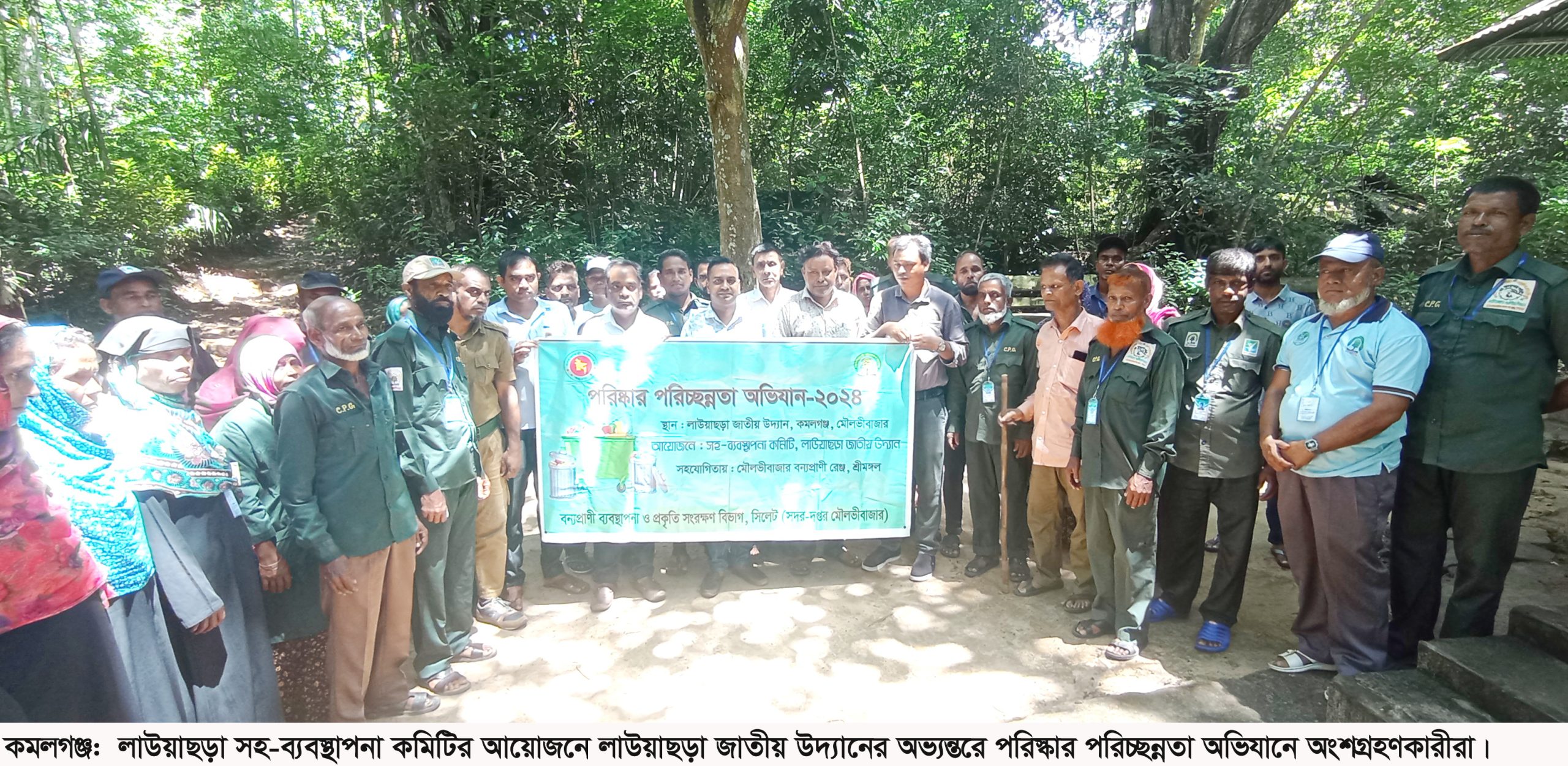 মৌলভীবাজারের কমলগঞ্জ কমলগঞ্জ উপজেলার লাউয়াছড়া জাতীয় উদ্যানে পরিষ্কার পরিচ্ছন্নতা অভিযান হয়েছে। সোমবার (৯ সেপ্টেম্বর) দুপুর ১২টায় লাউয়াছড়া সহ-ব্যবস্থাপনা কমিটির আয়োজনে লাউয়াছড়া জাতীয় উদ্যানের অভ্যন্তরে পরিস্কার পরিচ্ছন্নতা অভিযানে অংশ নেন বন্যপ্রাণী ব্যবস্থাপনা ও প্রকৃতি সংরক্ষণ বিভাগের সহকারী বন সংরক্ষক জামিল মোহাম্মদ খাঁন, রেঞ্জ কর্মকর্কা মো. শহিদুল ইসলাম, সহ-ব্যবস্থাপনা কমিটির সদস্য আহমেদুজ্জামান আলম, বিট কর্মকর্তা আনিছুর রহমান, প্রতিবেশ প্রকল্পের সাইট অফিসার মনিরুজ্জামান চৌধুরী, ফিল্ড অর্গানাইজার রিপা বেগম, সাংবাদিক আব্দুল আহাদসহ বন্যপ্রাণী বিভাগ ও কমিউনিটি পেট্রোল গ্রুপ (ঈচএ) এর সদস্যবৃন্দ।