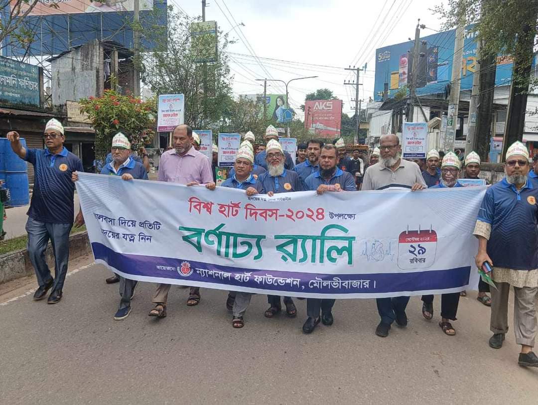 ন্যাশনাল হার্ট ফাউন্ডেশন মৌলভীবাজার এর সভাপতি মোসাহিদ আহমদ চুন্নুর নেতৃত্বে বেঙ্গল কনভেনশন হল থেকে একটি র্যালি বের হয়ে শহরের প্রধান প্রধান সড়ক প্রদক্ষিণ করে কুসুমবাগ খানদানি রেস্টুরেন্টে গিয়ে শেষ হয়।
