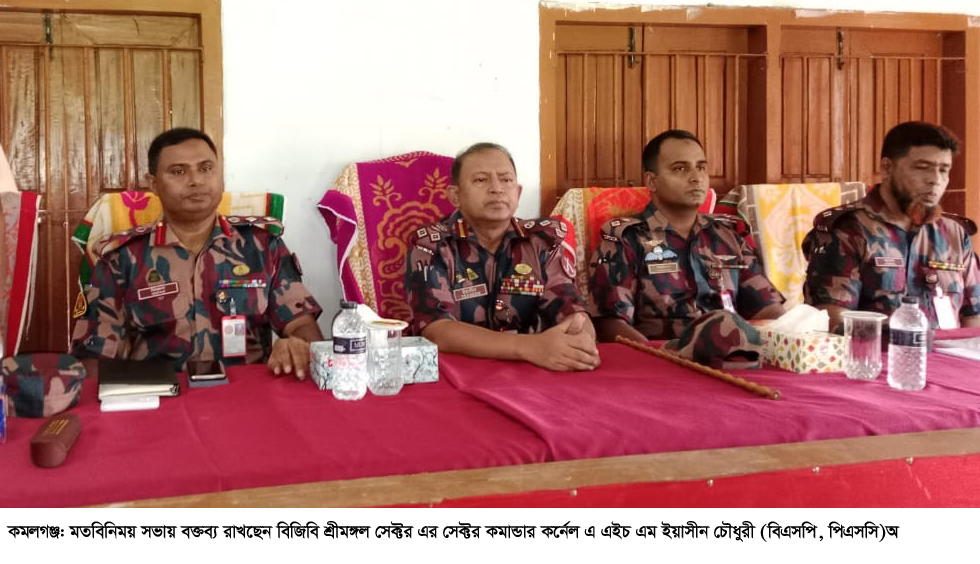 সনাতন ধর্মাবলম্বীদের সর্ববৃহৎ উৎসব শারদীয় দুর্গোৎসব সুষ্ঠু, সুন্দর, শান্তিপূর্ণ ও উৎসবমুখরভাবে উদযাপনের লক্ষ্যে মৌলভীবাজারের কমলগঞ্জ উপজেলার সীমান্তবর্তী ৯নং ইসলামপুর ইউনিয়ন পরিষদ হলরুমে বিজিবির শ্রীমঙ্গল ৪৬ ব্যাটালিয়নের উদ্যোগে পূজা উদযাপন কমিটির নেতৃবৃন্দের সাথে মতবিনিময় করা হয়েছে। সোমবার দুপুর সাড়ে ১২টায় মতবিনিময় সভায় বিজিবি শ্রীমঙ্গল সেক্টর এর সেক্টর কমান্ডার কর্নেল এ এইচ এম ইয়াসীন চৌধুরী (বিএসপি, পিএসসি) মপা সভাপতিত্বে ইসলামপুর ইউনিয়নের সীমান্তের ৮ কি:মি: এর বিদ্যমান ৯টি সার্ব্বজনীন ও ৩টি ব্যক্তিগত পূজামন্ডপের সভাপতি- সাধারণ সম্পাদক ও স্থানীয় গণ্যমান্য ব্যক্তিবর্গ উপস্থিত ছিলেন।