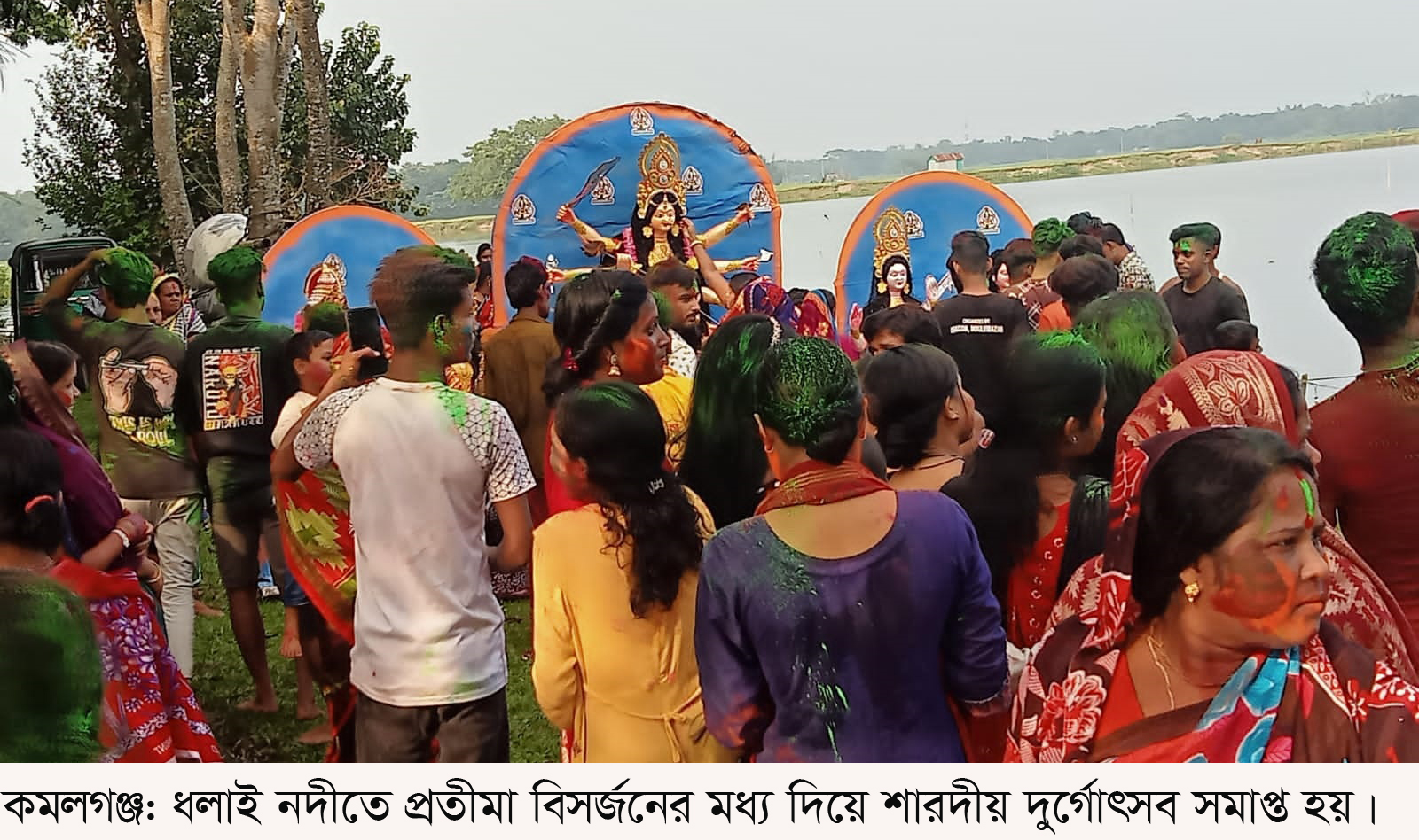 রোববার বেলা ৩টায় কমলগঞ্জ পৌর এলাকার পুরাতন ব্রিজ সংলগ্ন ধলাই নদীতে কমলগঞ্জ পৌর এলাকার বেশ কয়েকটি পূজাম-পের প্রতিমা বিসর্জন দেওয়া হয়। এ সময় উপস্থিত ছিলেন কমলগঞ্জ উপজেলা পূজা উদযাপন পরিষদের সভাপতি শ্যামল চন্দ্র দাশ, সাধারণ সম্পাদক প্রনীত রঞ্জন দেবনাথ, উপজেলা হিন্দু বৌদ্ধ খ্রিস্টান ঐক্য পরিষদের সভাপতি শংকর লাল সাহা, কমলগঞ্জ কেন্দ্রীয় দুর্গাবাড়ি পূজামন্ডপের সভাপতি প্রদীপ দত্ত রেন্টু, সাধারণ সম্পাদক লিটন দত্তসহ বিভিন্ন ম-প কমিটির সদস্যবৃন্দ, সেনাবাহিনী, পুলিশ, আনসারসহ বিভিন্ন আইনশৃঙ্খলা বাহিনীর সদস্য ও এলাকার সনাতনী ভক্তবৃন্দ উপস্থিত ছিলেন। এছাড়া ধলাই নদীর পাত্রখোলা, মাধবপুর, কুরমা, চৈত্রঘাট, ঘোড়ামারাসহ বিভিন্ন স্থান এবং লাঘাটা, ক্ষিরণীসহ বিভিন্ন পুকুর ও জলাশয়ে প্রতিমা বিসর্জন শেষে শান্তিজল গ্রহণ করা হয়। সেখানে ধুপ-ধোঁয়ার আরতি, ঢাকের বাদ্য আর উলুধ্বনিতে এক স্বর্গীয় আবেশের সৃষ্টি হয়।