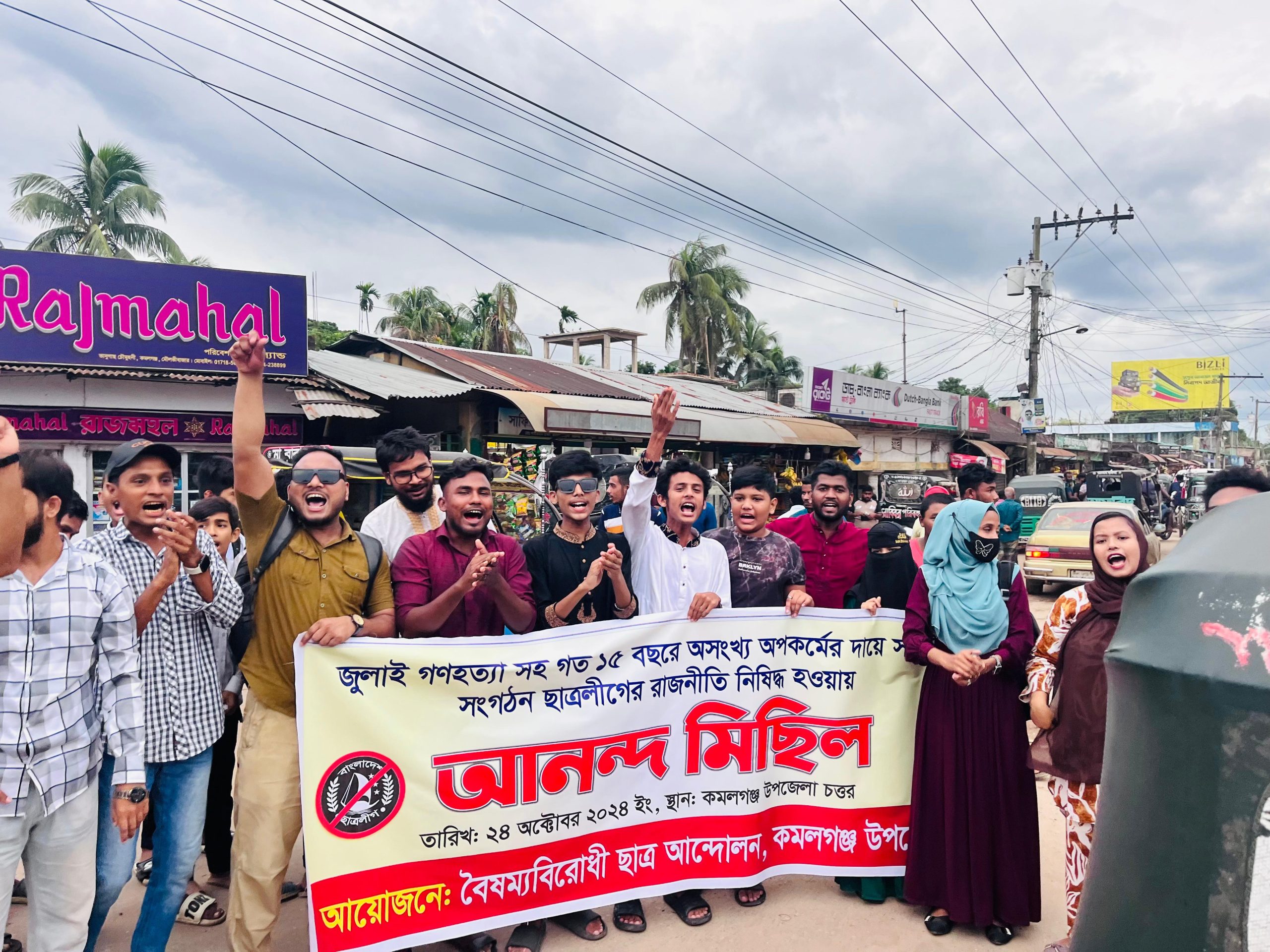 শামসুর রহমান শান্ত প্রমুখ। উক্ত আনন্দ মিছিলে কমলগঞ্জের সর্বস্তরের শিক্ষার্থীরা অংশগ্রহণ করে এবং আওয়ামীলীগ ফ্যাসিবাদের বিরুদ্ধে প্রতিরোধ গড়ে তুলতে সর্ববস্থায় প্রস্তুতির ওয়াদাবদ্ধ হয়।