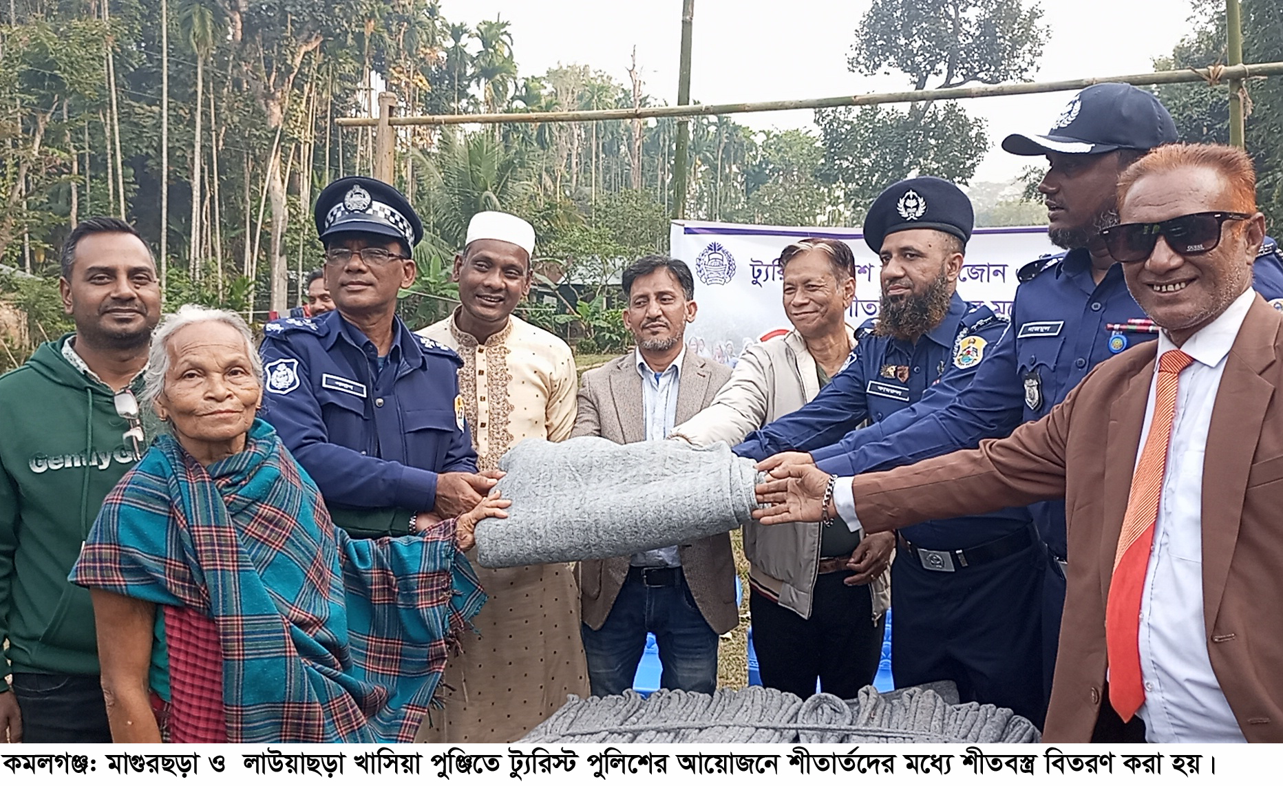 মৌলভীবাজারের কমলগঞ্জে ট্যুরিস্ট পুলিশের আয়োজনে শীতার্তদের মধ্যে শীতবস্ত্র বিতরণ করা হয়েছে। বৃহস্পতিবার (১৯ ডিসেম্বর) বিকেলে কমলগঞ্জ উপজেলার মাগুরছড়া ও লাউয়াছড়া খাসিয়া পুঞ্জিতে বসবাসরত ক্ষুদ্র নৃতাত্বিক জনগোষ্ঠী শতাধিক পরিবারের মধ্যে শীতবস্ত্র (কম্বল) বিতরণ করা হয়। এ সময় উপস্থিত ছিলেন ট্যুরিস্ট পুলিশ শ্রীমঙ্গল জোনের অফিসার ইনচার্জ কামরুল ইসলাম চৌধুরী, মাগুরছড়া পুঞ্জির মন্ত্রী জিডিশন প্রধান সুচিয়াং, লাউয়াছড়া পুঞ্জির মন্ত্রী ফিল্মা ফতমি, কমলগঞ্জ প্রেসক্লাবের আহবায়ক এম, এ, ওয়াহিদ রুলু, সদস্য সচিব আহমেদুজ্জামান আলম, কমলগঞ্জ রিপোর্টার্স ইউনিটির সভাপতি পিন্টু দেবনাথ, দৈনিক অবজারভার প্রতিনিধি সালাউদ্দিন শুভ, দৈনিক খোলাচিঠির বার্তা সম্পাদক নান্টু রায়, যায়যায়দিন শ্রীমঙ্গল প্রতিনিধি শফিকুল ইসলাম রুমন, দি এশিয়ান এইজ প্রতিনধি মো. মোনায়েম খান, বাংলাদেশ বেতার প্রতিনিধি আর কে সোমেনসহ আরো অনেকে।
