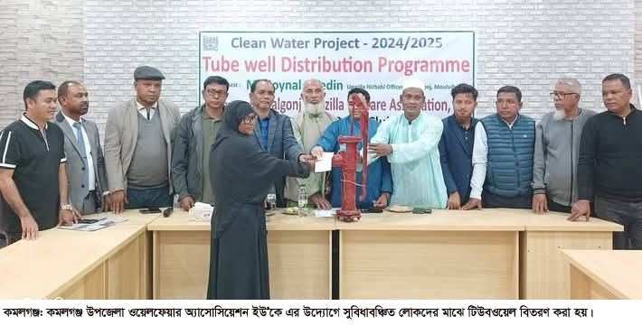 মৌলভীবাজারের কমলগঞ্জে জনগণের স্বাস্থ্য এবং জীবনমানের উন্নতির লক্ষ্যে কমলগঞ্জ উপজেলা ওয়েলফেয়ার এসোসিয়েশন ইউ’কের উদ্যোগে এবং কমলগঞ্জ প্রেসক্লাবের সহযোগিতায় কমলগঞ্জের বিভিন্ন ইউনিয়ন, পৌরসভা এবং দুইটি মসজিদে সর্বমোট ১২টি টিউবওয়েল বিতরণ করা হয়েছে। বুধবার সন্ধ্যায় কমলগঞ্জ প্রেসক্লাব মিলনায়তনে আয়োজিত অনুষ্ঠানে প্রধান অতিথি উপস্থিত ছিলেন কমলগঞ্জ উপজেলা নির্বাহী কর্মকর্তা জয়নাল আবেদীন।