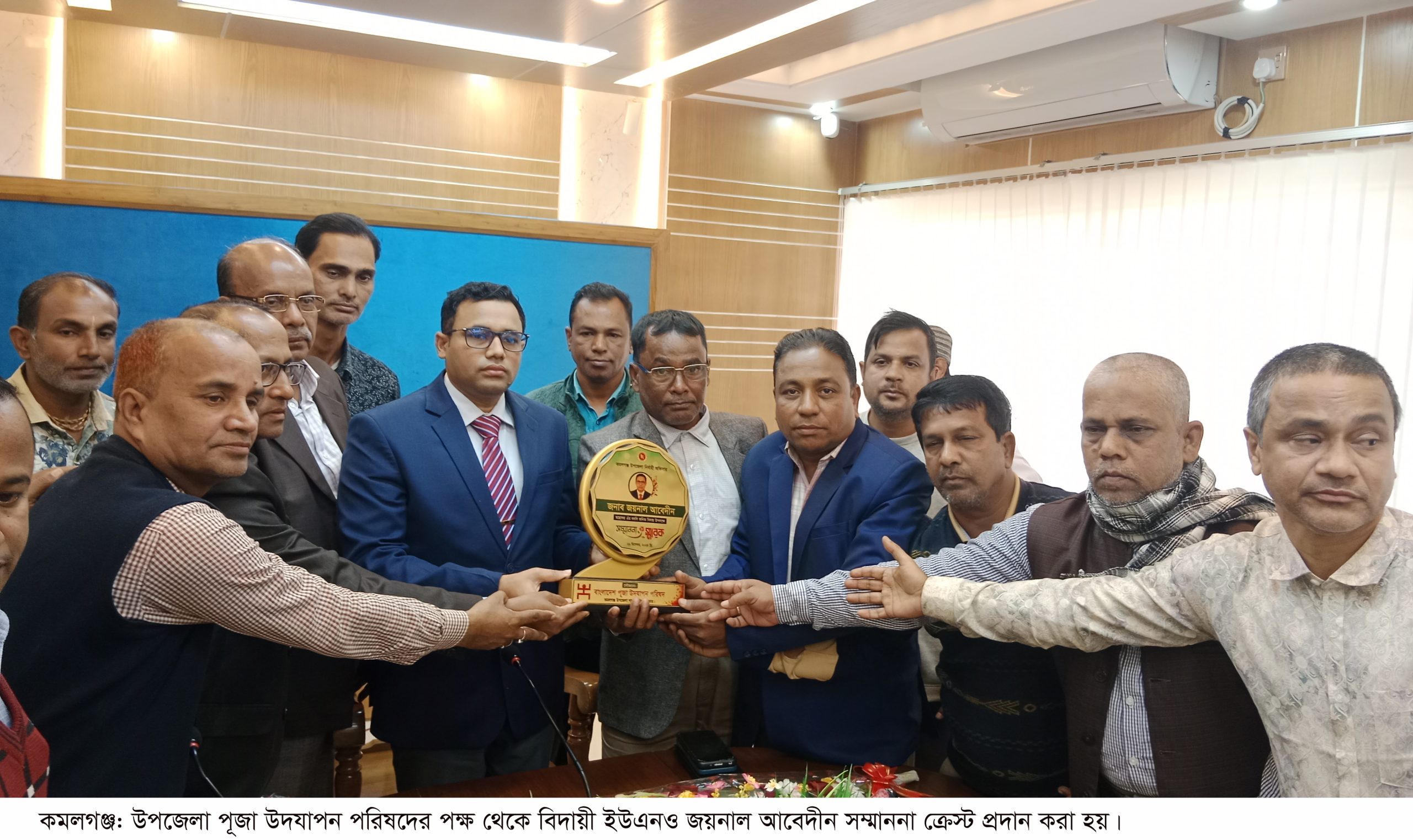 মৌলভীবাজারের কমলগঞ্জ উপজেলা নির্বাহী কর্মকর্তা হিসাবে জয়নাল আবেদীন এর অন্যত্র বদলী উপলক্ষে বিভিন্ন সংগঠনের পক্ষ থেকে বিদায় সংবর্ধনা প্রদান করা হয়েছে। বৃহস্পতিবার দুপুর ২টায় কমলগঞ্জ উপজেলা পূজা উদযাপন পরিষদ ও উপজেলা হিন্দু বৌদ্ধ খ্রিস্টান ঐক্য পরিষদের পক্ষ থেকে বিদায়ী ইউএনওকে সম্মাননা স্মারক প্রদান করা হয়। উপজেলা পূজা উদযাপন পরিষদের সাধারণ সম্পাদক সাংবাদিক প্রনীত রঞ্জন দেবনাথের সঞ্চালনায় এ সময় বক্তব্য রাখেন উপজেলা পূজা উদযাপন পরিষদ সভাপতি শ্যামল চন্দ্র দাশ, উপজেলা হিন্দু বৌদ্ধ খ্রিস্টান ঐক্য পরিষদের সভাপতি শংকর লাল সাহা, সাধারণ সম্পাদক নিরঞ্জন দেব, উপজেলা পূজা উদযাপন পরিষদের সাংগঠনিক সম্পাদক প্রত্যুষ ধর, প্রধান শিক্ষক অসমঞ্জু প্রসাদ রায় চৌধুরী, প্রধান শিক্ষক শংকর চন্দ্র দেবনাথ, শিক্ষক সমরেন্দু সেনগুপ্ত বুলবুল প্রমুখ।