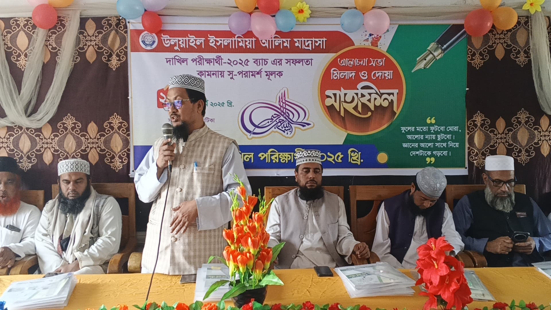মৌলভীবাজার প্রতিনিধি : মৌলভীবাজারের ঐতিহ্যবাহী উলুয়াইল ইসলামিয়া আলিম মাদ্রাসার ২০২৫ দাখিল পরীক্ষার্থীদের সফলতা কামনায় মাদ্রাসা হল রুমে এক আলোচনা সভা ও দোয়া মাহফিল অনুষ্ঠিত হয়। দোয়া মাহফিলে সভাপতিত্ব করেন মাদ্রাসার অধ্যক্ষ মূফতী মাওলানা বশির আহমদ। প্রধান অতিথি হিসেবে উপস্থিত ছিলেন উলুয়াইল ইসলামিয়া এতিমখানার সভাপতি পাঁচ মৌজার বিশিষ্ট মুরব্বির, জনাব মোহাম্মদ শাহ্ আলাউর রাহমান ,মাহফিলে বক্তব্য রাখেন মাদ্রাসার ভাইস প্রিন্সিপাল মূফতী হাবিবুর রহমান, আরবী প্রভাষক মাওলানা আব্দুর রকিব , মূফতী মাওলানা ফারুক মিয়া, মুফতী শাহ মুজাহিদ আলী আজমী, মাওলানা মূফতী মুজিবুর রহমান, মাওলানা শামসুদ্দিন, মাওলানা ক্বারী নজরুল ইসলাম নূরানী, শিক্ষক জনাব আবদুর রহিম, জনাব আবুবক্কর শিপন, জনাব সুজেব আহমদ প্রমূখ। অধ্যক্ষ সাহেবের দোয়ার মাধ্যমে অনুষ্ঠান সম্পন্ন হয়।