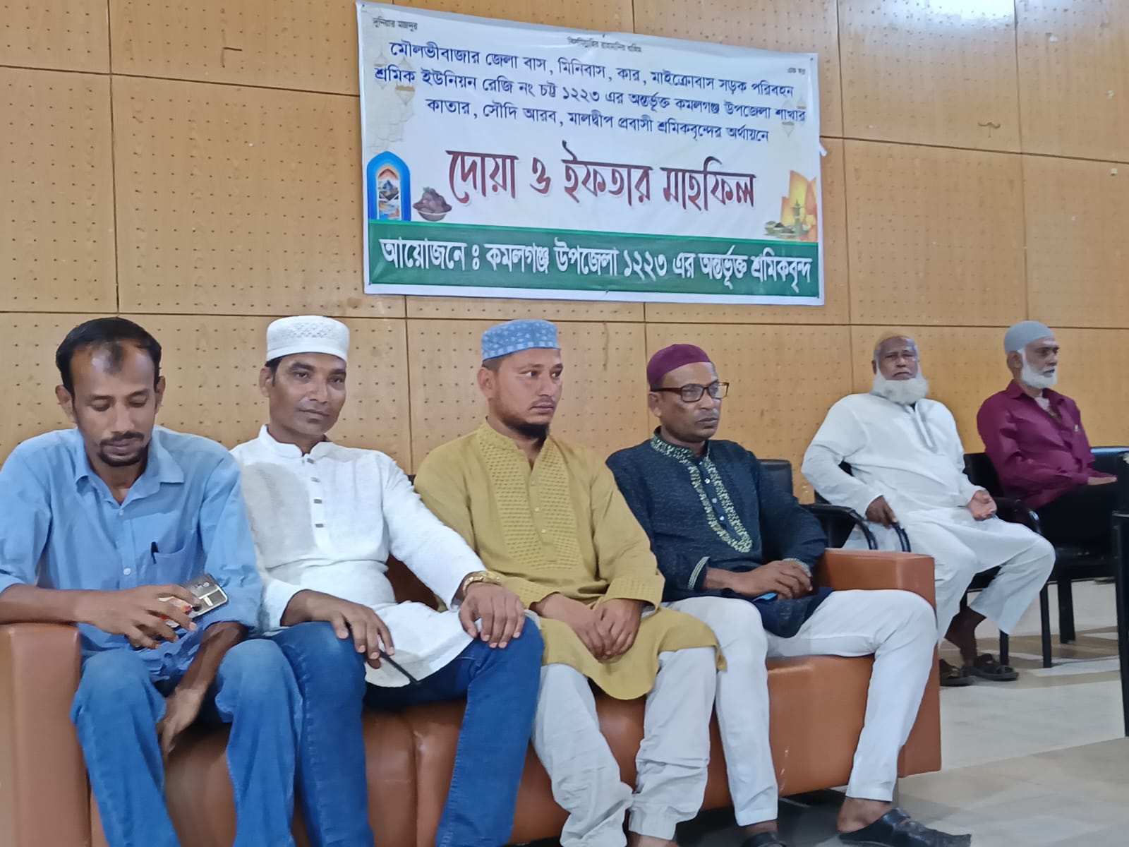 মৌলভীবাজার জেলা বাস, মিনিবাস, কোচ, মাইক্রোবাস সড়ক পরিবহন শ্রমিক ইউনিয়ন রেজি নং চট্ট ১২২৩ এর অর্ন্তভুক্ত কমলগঞ্জ উপজেলা শাখার কাতার, সৌদি আরব ও মালদ্বীপ প্রবাসী পরিবহন শ্রমিকবৃন্দের অর্থায়নে ও কমলগঞ্জ উপজেলা শাখার সার্বিক সহযোগিতায় অদ্য ১৭মার্চ ২০২৫ ইংরেজি ১৬ রামাদ্বান রোজ সোমবার কমলগঞ্জ অডিটরিয়ামে এক ইফতার ও দোয়া মাহফিল অনুষ্ঠিত হয়। কমলগঞ্জ উপজেলা শাখার সভাপতি আলমগির হোসেন লালন এর সভাপতিত্বে সাধারণ সম্পাদক জাহাঙ্গীর আলম এর সঞ্চালনায় বক্তব্য রাখেন মৌলভীবাজার জেলা বাস মিনিবাস কোস মাইক্রোবাস সড়ক পরিবহন শ্রমিক ইউনিয়ন রেজি নং চট্র: ১২২৩ এর ভারপ্রাপ্ত সভাপতি আক্তার হোসেন লেবু, সাধারণ সম্পাদক সালেহ আহমেদ, সাংগঠনিক সম্পাদক বাবলু আহমেদ, সহ সভাপতি শাহেদ আহমেদ, অর্থ সম্পাদক গিয়াস উদ্দিন নানু, সাংস্কৃতিক সম্পাদক খসরু মিয়া,দপ্তর সম্পাদক ছত্তার মিয়া প্রমুখ। বাস মিনিবাস কোস মাইক্রোবাস সড়ক পরিবহন শ্রমিক ইউনিয়ন রেজি নং চট্র: ১২২৩ এর অন্তর্ভূক্ত কমলগঞ্জ উপজেলা শাখার কার্যকরি সভাপতি হামিদ মিয়া, সহ সভাপতি আলিম উদ্দিন, সহ সাধারণ সম্পাদক রিয়াসত আলী, সাংগঠনিক সম্পাদক আলমগির মিয়া, অর্থ সম্পাদক মো: আব্দুল্লাহ, দপ্তর সম্পাদক সুজেল মিয়া,লাইন সম্পাদক জুয়েল মিয়া, প্রচার সম্পাদক ইব্রাহিম খলিল, সদস্য ছলিম মিয়া,রনি আহমেদ, মামুন আহমেদ প্রমুখ। এছাড়াও মুন্সিবাজার, আদমপুর গ্রুপ কমিটির নেতৃবৃন্দ।