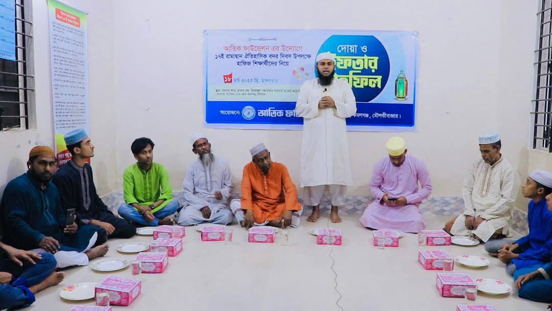 আজ ১৭ই রামাদ্বান রোজ মঙ্গলবার ১৮ মার্চ ২০২৫ইং ঐতিহাসিক বদর দিবস উপলক্ষে কুমড়াকাপন এলাকার মানবতার সংগঠন আতিক ফাউন্ডেশনের পক্ষ থেকে কমলগঞ্জ পৌরসভার ৮নং ওয়ার্ড রামপাশা আংশিক গ্রামে অবস্থিত হযরত শাহ আজম রহ. হিফজুল কোরআন দরগাহ মডেল মাদ্রাসায় ছাত্রদের নিয়ে ইফতার মাহফিলের আয়োজন করা হয়। উক্ত মাহফিলে উপস্থিত ছিলেন আতিক ফাউন্ডেশনের সম্মানিত প্রধান উপদেষ্টা মোহাম্মদ আতাউর রহমান, সভাপতি রুজেল আহমদ, সহ-সভাপতি মোঃ ফেরদৌস মিয়া, সাধারণ সম্পাদক হিফজুর রহমান সিজিল, যুগ্ম-সাধারণ সম্পাদক রিফাতুর রহমান রিমন, সাংগঠনিক সম্পাদক মোহাম্মদ মান্না মিয়া, কোষাধ্যক্ষ শাহরিয়ার হোসেন মাহি, কার্যকরী সদস্য শাহাদাত হোসেন জিবু। ইফতার মাহফিলে আরো উপস্থিত ছিলেন আতিক ফাউন্ডেশনের শুভাকাঙ্ক্ষী মাওলানা মুফতি শাহ মোহাম্মদ মোজাহিদ আলী আজমী, মাদ্রাসার প্রধান শিক্ষক হাফিজ জিবন আহমদ, দুবাই প্রবাসী শাহ মোহাম্মদ মোতাহির আলী আজমী, মোহাম্মদ আব্দুর রহমান, আলোর পথিক সমাজ কল্যাণ সংস্থার সভাপতি সায়েদ আহমদ, মোহাম্মদ আলাজ মিয়া, মোহাম্মদ জয়নাল মিয়া, সাবেদ আহমদ, সুজন আহমদ, মোহাম্মদ চেরাগ মিয়া, মোহাম্মদ মখলিছুর রহমানসহ প্রমুখ। মিডিয়ার দায়িত্বে ছিলেন ফটোগ্রাফার মোহাম্মদ মাহদি হাসান জিলানি। আতিক ফাউন্ডেশনের ইফতার মাহফিল কর্মসূচী ও বদর দিবসের আলোচনা শেষে মোনাজাত পরিচালনা করেন মাওলানা মুফতি শাহ মোহাম্মদ মোজাহিদ আলী আজমী। উক্ত মাহফিলে আতিক ফাউন্ডেশনের প্রতিষ্ঠাতা চেয়ারম্যান লন্ডন প্রবাসী মোহাম্মদ আতিকুর রহমান বিডিও কনফারেন্স কলে যুক্ত ছিলেন। মহতি উদ্যোগ গ্রহণের জন্য আতিক ফাউন্ডেশনের প্রতিষ্ঠাতা চেয়ারম্যানের প্রতি কৃতজ্ঞতা প্রকাশ।