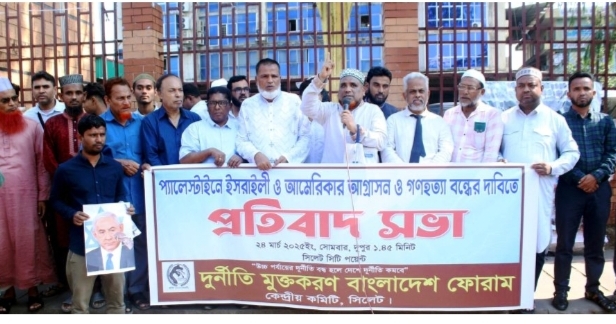 প্যালেস্টাইনে ইসরাইল-আমেরিকার আগ্রাসন ও গণহত্যার প্রতিবাদে দুর্নীতি মুক্তকরণ বাংলাদেশ ফোরাম কেন্দ্রীয় কমিটির উদ্যোগে সোমবার (২৪ মার্চ) সিলেট সিটি পয়েন্টে এক বিরাট প্রতিবাদ সভা অনুষ্ঠিত হয়। কেন্দ্রীয় সিনিয়র সহ-সভাপতি ইকবাল হোসেন চৌধুরীর সভাপতিত্বে সভায় প্রধান বক্তা ছিলেন দুর্নীতি মুক্তকরণ বাংলাদেশ ফোরামের সাধারণ সম্পাদক জননেতা মকসুদ হোসেন।