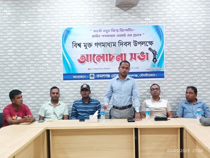 বিশ্ব মুক্ত গণমাধ্যম দিবস উপলক্ষে মৌলভীবাজারের কমলগঞ্জ প্রেসক্লাবের আয়োজনে "সাহসী নতুন বিশ্বে রিপোর্টিং-স্বাধীন গণমাধ্যমে এআইয়ের প্রভাব" এই প্রতিপাদ্য বিষয় নিয়ে আলোচনা সভা অনুষ্ঠিত। শনিবার (৩ মে) রাত সাড়ে ৮ টায় কমলগঞ্জ প্রেসক্লাবের হলরুমে প্রেসক্লাবের আহ্বায়ক এম এ ওয়াহিদ রুলুর সভাপতিত্বে প্রধান অতিথি হিসেবে উপস্থিত ছিলেন কমলগঞ্জ উপজেলা নির্বাহী কর্মকর্তা মাখন চন্দ্র সুত্রধর। সাংবাদিক নির্মল এস পলাশের সঞ্চালনায় বিশেষ অতিথি ছিলেন কমলগঞ্জ থানার অফিসার ইনচার্জ সৈয়দ ইফতেখার হোসেন। অন্যান্যদের মধ্যে বক্তব্য রাখেন, কমলগঞ্জ প্রেসক্লাবের সদস্য সচিব আহমেদুজ্জামান আলম, সাংবাদিক প্রণীত রঞ্জন দেবনাথ, শাহীন আহমেদ, মোস্তাফিজুর রহমান,আসহাবুজ্জামান শাওন, সালাহউদ্দিন শুভ,শামীম তালুকদার,মোনায়েম খান,মুমিন আহমেদ,জালাল উদ্দিন প্রমূখ।