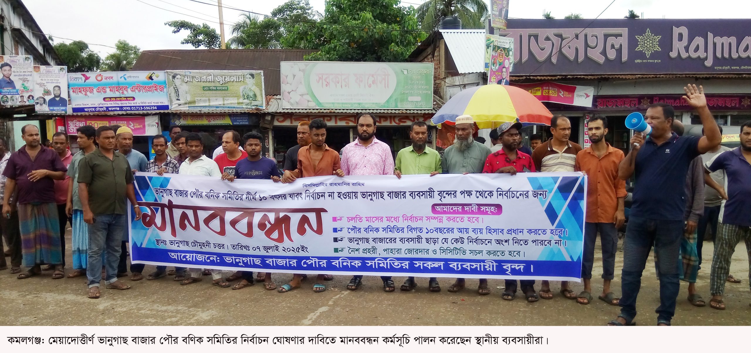 মৌলভীবাজারের কমলগঞ্জে মেয়াদোত্তীর্ণ ভানুগাছ বাজার পৌর বণিক সমিতির নির্বাচন ঘোষণার দাবিতে মানববন্ধন কর্মসূচি পালন করেছেন স্থানীয় ব্যবসায়ীরা। সোমবার (৭ জুলাই) দুপুর ১২টায় ভানুগাছ বাজার চৌমুহনী এলাকায় ঘণ্টাব্যাপী এ মানববন্ধনে ব্যানার-ফেস্টুন নিয়ে অংশ নেন শতাধিক ব্যবসায়ী।
