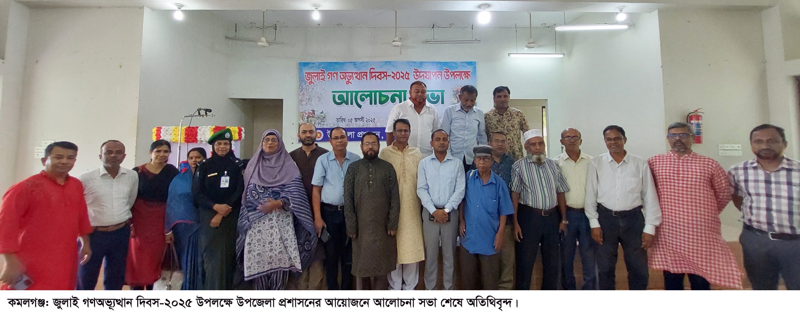 মৌলভীবাজারের কমলগঞ্জে জুলাই গণঅভ্যূত্থান দিবস-২০২৫ উপলক্ষে উপজেলা প্রশাসনের আয়োজনে উপজেলা পরিষদ হল রুমে মঙ্গলবার (৫ আগস্ট) সকাল ১১ টায় এক আলোচনা সভা অনুষ্ঠিত হয়। কমলগঞ্জ উপজেলা নির্বাহী কর্মকর্তা মাখন চন্দ্র সূত্রধরের সভাপতিত্বে ও উপজেলা প্রকল্প বাস্তবায়ন কর্মকর্তা প্লাবন পালের সঞ্চালনায় এ সময় অন্যান্যের মধ্যে বক্তব্য রাখেন উপজেলা বিএনপির আহবায়ক ও পতনঊষার ইউপি চেয়ারম্যান অলি আহমদ খান, উপজেলা বিএনপির সাবেক সভাপতি ও কমলগঞ্জ সদর ইউনিয়নের সাবেক চেয়ারম্যান গোলাম কিবরিয়া শফি, উপজেলা জামায়াতে ইসলামীর আমীর অধ্যক্ষ মো. মাসুক মিয়া, উপজেলা বিএনপি যুগ্ম আহবায়ক মো. আবুল হোসেন, উপজলা প্রকৌশলী সাইফুল আযম, উপজেলা কৃষি কর্মকর্তা জয়ন্ত কুমার রায়, সাংবাদিক নির্মল এস পলাশ, বৈষম্য বিরোধী ছাত্র আন্দোলনের প্রতিনিধি ভূঁইয়া রাজন রেজা প্রমুখ। এছাড়াও অনুষ্ঠানে বিভিন্ন দপ্তরের কর্মকর্তা, বিভিন্ন শিক্ষা প্রতিষ্ঠানের শিক্ষক-শিক্ষার্থী, সাংবাদিক, রাজনৈতিক দলের নেতৃবৃন্দ ও বিভিন্ন শ্রেণী পেশার লোকজন উপস্থিত ছিলেন।