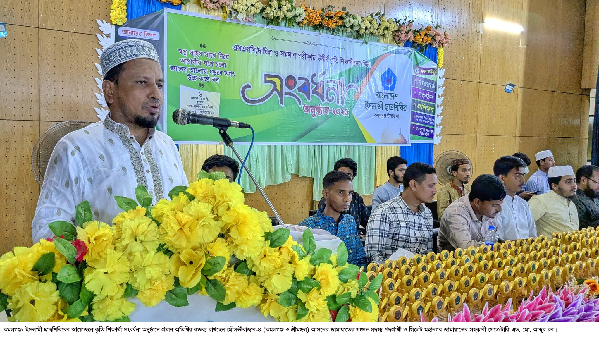 মৌলভীবাজারের কমলগঞ্জে এসএসসি ও সমমনা পরীক্ষায় জিপিএ-৫ প্রাপ্ত ৩শত ৬০জন শিক্ষার্থীকে ফুল, ক্রেস্ট ও উপহার প্রদানের মাধ্যমে সংবর্ধনা দিয়েছে বাংলাদেশ ইসলামী ছাত্র শিবির। বুধবার (৬ আগস্ট) সকাল ১০টায় দলটির উপজেলা শাখার আয়োজনে জেলা পরিষদ অডিটোরিয়ামে এ সংবর্ধনার আয়োজন করা হয়। এতে প্রধান অতিথি ছিলেন মৌলভীবাজার-৪ (কমলগঞ্জ ও শ্রীমঙ্গল) আসনের জামায়াতের সংসদ সদস্য পদপ্রার্থী ও সিলেট মহানগর জামায়াতের সহকারী সেক্রেটারি, ইসলামী ছাত্রশিবিরের কেন্দ্রীয় সাংস্কৃতিক বিষয়ক সম্পাদক ও বাংলাদেশ সুপ্রিম কোর্টের আইনজীবী মো. আব্দুর রব। বিশেষ অতিথি ছিলেন সফাত আলী সিনিয়র ফাজিল মাদ্রাসার প্রভাষক আজিজ আহমদ কিবরিয়া, কমলগঞ্জ উপজেলা জামায়াতের আমির অধ্যক্ষ মো. মাসুক মিয়া, সাধারণ সম্পাদক এড. কামরুল ইসলাম, মৌলভীবাজার শহর এর সাধারন সম্পাদক কাজী দহিয়ান, জেলার সাধারণ সম্পাদক মহসিন আহমদ, জেলা দাওতি সম্পাদক আব্দুল মুহিদ মুর্শেদ, জেলা কলেজ সম্পাদক তারেক রহমান, জামায়াতের সহকারী সম্পাদক মনসুর আলী, কমলগঞ্জ পৌর জামায়াতের সভাপতি মো. আব্দুল হাই প্রমুখ।