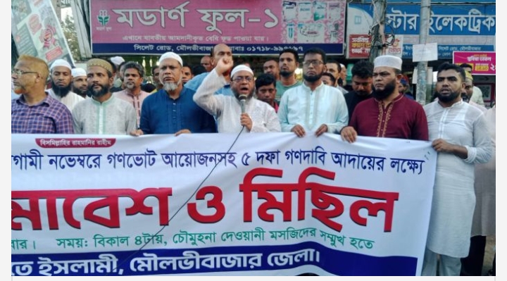 নভেম্বরে গণভোট ও ফেব্রুয়ারিতে জাতীয় নির্বাচনসহ ৫ দফা দাবীতে মৌলভীবাজার জেলা জামায়াতের উদ্যোগে অদ্য ২৭ অক্টোবর বিক্ষোভ মিছিল ও সমাবেশ করেছে বাংলাদেশ জামায়াতে ইসলামী মৌলভীবাজার জেলা।বাদ আসর শহরের চৌমুহনা দেওয়ানী মসজিদের সম্মুখ থেকে বিক্ষোভ মিছিলটি বের হয়ে শহরের প্রধান প্রধান সড়ক প্রদক্ষিণ করে কুসববাগ চত্বরে গিয়ে সমাবেশে মিলিত হয় । "অবিলম্বে জুলাই সনদ বাস্তবায়ন করতে হবে ", "অবিলম্বে গণভোট দিতে হবে দিয়ে দাও " "৫ দফা দাবি জনতার দাবি মানতে হবে মেনে নাও" প্রভৃতি স্লোগান সম্বলিত এ দীর্ঘ মিছিলে উপস্থিত ছিলেন জেলা আমীর ইঞ্জিনিয়ার মোঃ শাহেদ আলী, জেলা সেক্রেটারি মোঃ ইয়ামীর আলী, জেলা শ্রমিক কল্যাণ ফেডারেশনের সভাপতি মোঃ আলাউদ্দিন শাহ, জেলা এসিস্ট্যান্ট সেক্রেটারি মাওলানা হারুনুর রশিদ তালুকদার ও আজিজ আহমদ কিবরিয়া, পৌর আমীর হাফেজ মাওলানা তাজুল ইসলাম, সদর উপজেলা আমীর মোঃ ফখরুল ইসলাম, শহর শাখা শিবির সভাপতি তারেক আজিজ, রাজনগর উপজেলা আমীর আবুর রাইয়ান শাহীন, কমলগঞ্জ উপজেলা নায়েবে আমীর সৈয়দ আমিরুল ইসলাম কয়ছর, শ্রীমঙ্গল উপজেলা সেক্রেটারি আশরাফুল ইসলাম কামরুল, মৌলভীবাজার পৌর সেক্রেটারি আনোয়ার হোসেন চৌধুরী মোর্শেদ, কমলগঞ্জ উপজেলা সেক্রেটারি এডভোকেট কামরুল ইসলাম, রাজনগর উপজেলা সেক্রেটারী মিসবাহুল হাসান, ছাত্রশিবির শহর সেক্রেটারি কাজী দাইয়ান আহমদ প্রমুখ ।