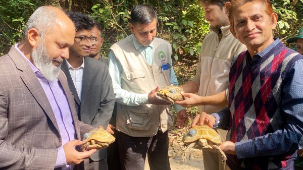 কমলগঞ্জ (মৌলভীবাজার) প্রতিনিধি: মৌলভীবাজারের কমলগঞ্জের লাউয়াছড়া জাতীয় উদ্যানে বিলুপ্ত প্রায় ৬টি হলুদ কচ্ছপে ট্রান্সমিটার সংযুক্ত করে অবমুক্ত করা হয়েছে। বুধবার (১৮ ডিসেম্বর) দুপুরে ক্রিয়েটিভ কনজারভেশন এল্যায়েন্সের উদ্যোগে এই অতি বিপন্ন