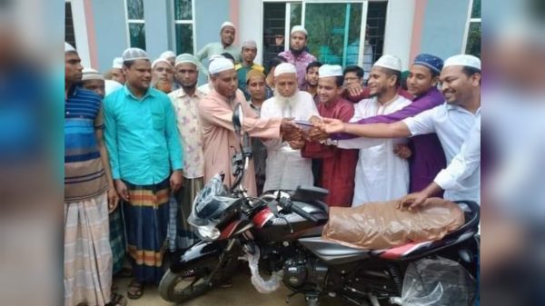 অগ্রযাত্রা সংবাদঃ এমন মুসল্লী কয়জন ইমামের ভাগ্যে জোটে! সিলেট জেলার কানাইঘাটের মূলাগুল সাউদ গ্রামের জামে মসজিদের ইমামকে এলাকার মুসল্লীরা ইমাম সাহেবের কষ্ট লাঘব করার জন্য ভালোবেসে একটি মোটরসাইকেল উপহার দিচ্ছে।