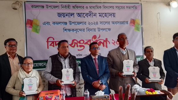নিজস্ব প্রতিবেদকঃ মৌলভীবাজার জেলার কমলগঞ্জ উপজেলা মাধ্যমিক শিক্ষক সমিতির আয়োজনে ‘কমলগঞ্জ উপজেলা নির্বাহী অফিসার জয়নাল আবেদীন’ ও ২০২৪ সালে অবসরপ্রাপ্ত ৪ জন শিক্ষককে বিদায় সংবর্ধনা প্রদান করা হয়।বৃহস্পতিবার সকাল সাড়ে