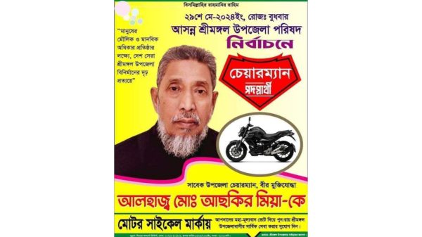 মোঃইমরান হোসেন মৌলভীবাজার: আসন্ন ২৯ মে শ্রীমঙ্গল উপজেলা পরিষদ নির্বাচনকে সামনে রেখে উপজেলা চেয়ারম্যান পদপ্রার্থী সাবেক সফল চেয়ারম্যান ও বীর মুক্তিযোদ্ধা আলহাজ্ব মোঃআছকির মিয়া মোটর সাইকেল প্রতীক নিয়ে ভোটারদের ধারে